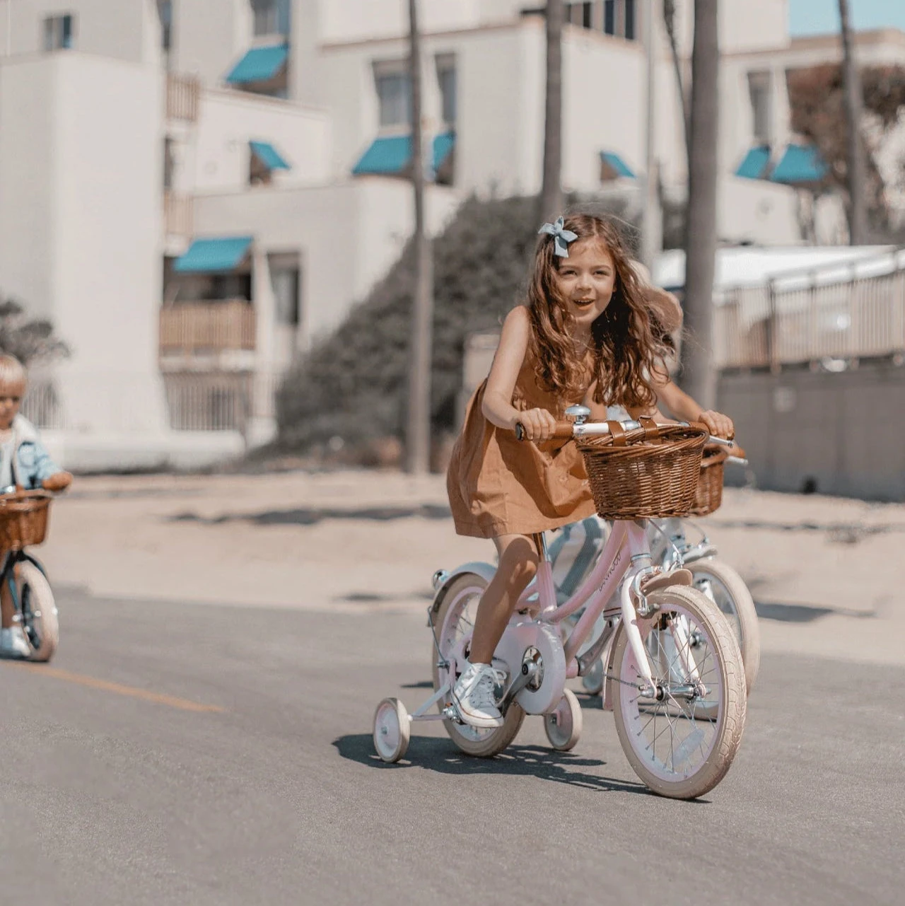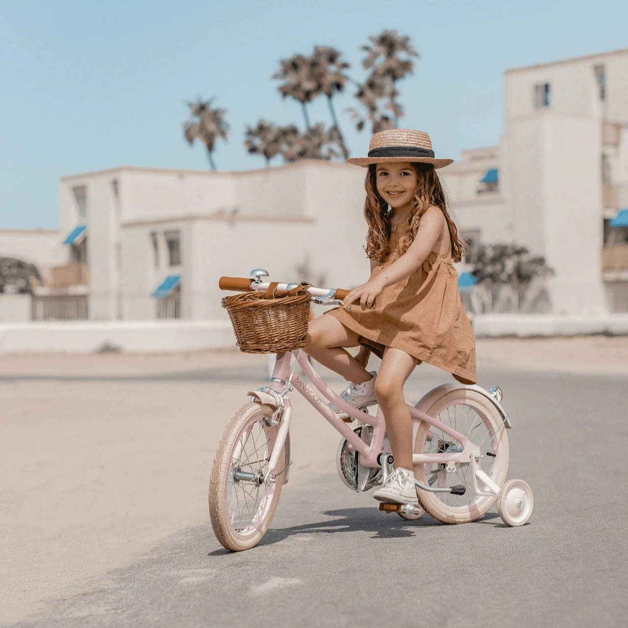 And your mini me cyclist will be the coolest kid on the block with the bike sporting Banwood’s brown faux leather saddle and grips in matching colors, Banwood’s unique rosewood vintage pedal, cream 16” tires and a detachable wicker basket in rattan – perfect for packing in the essentials (think lunch, water bottle and favorite toy!) for a day’s adventure.
