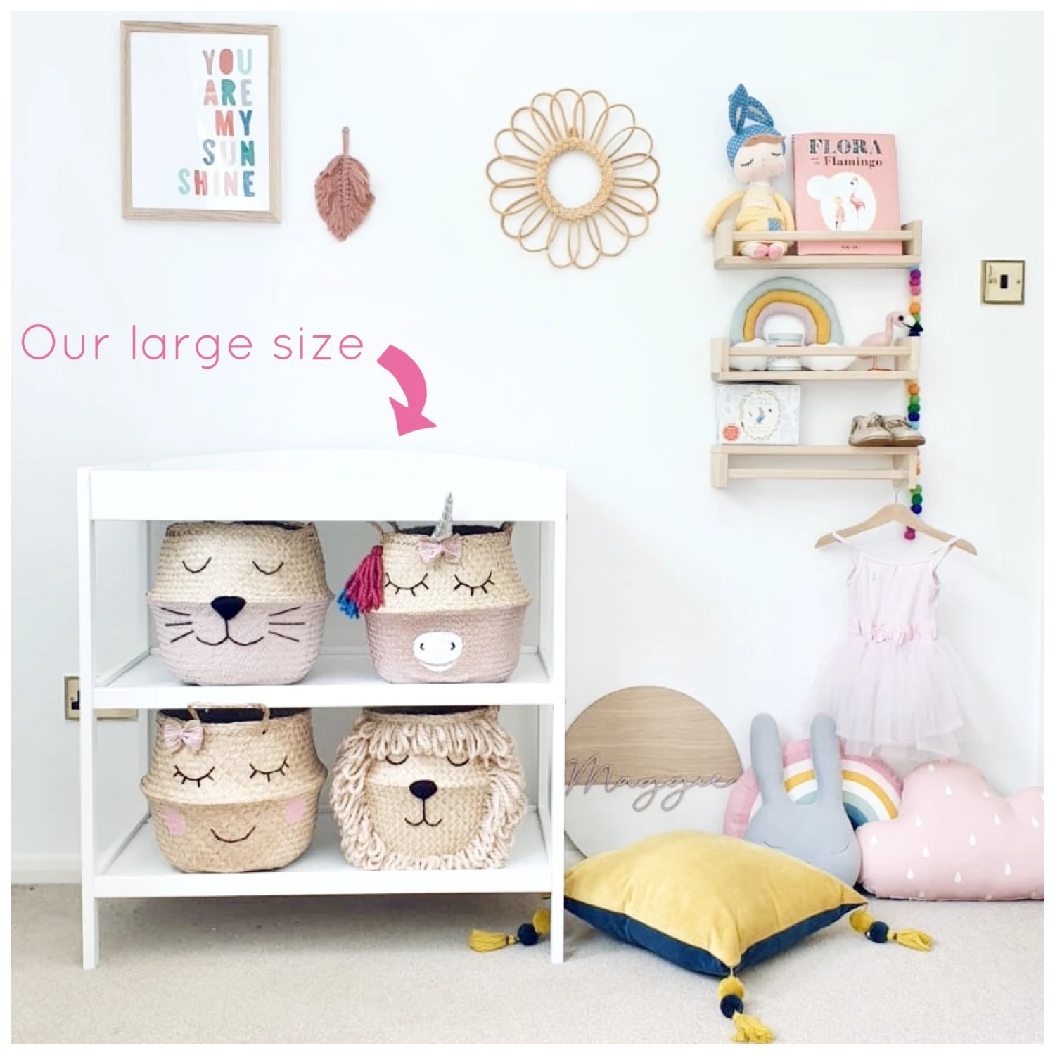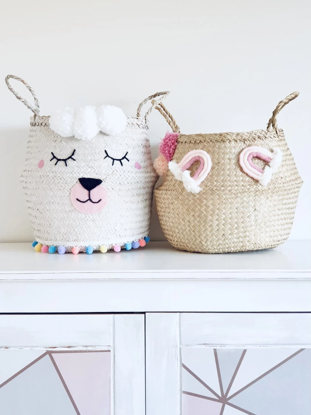 This gorgeous white llama basket has white pom pom hair and pastel pom pom trim, and sweet pink rosey cheeks. A super cute addition to a nursery or bedroom.