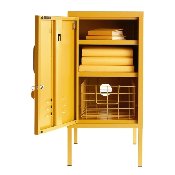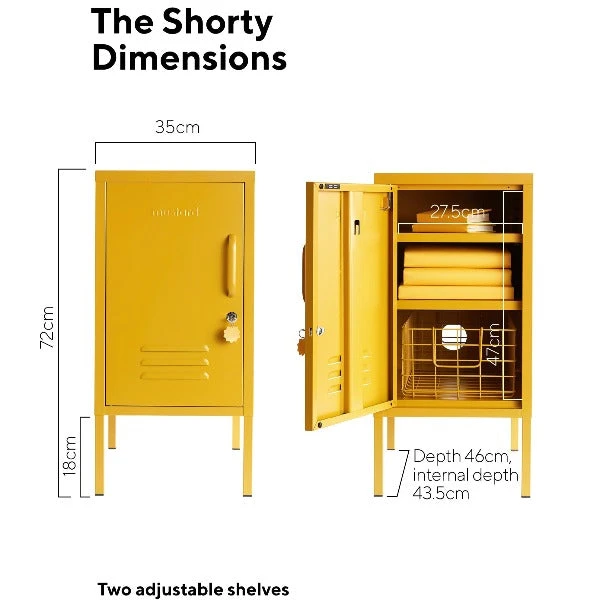 Two adjustable shelves, one handy hook, cable hole, wall attachment points. Handle, lock, custom keyring, Mustard logo, air vents. Our lockers are cleverly designed to arrive flat packed for you to assemble.