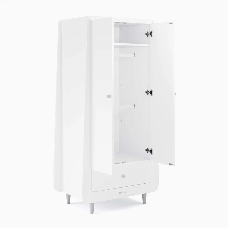 The SnuzKot Wardrobe features adjustable shelving and rails, a spacious interior, and a large drawer perfect for bedding or essentials.