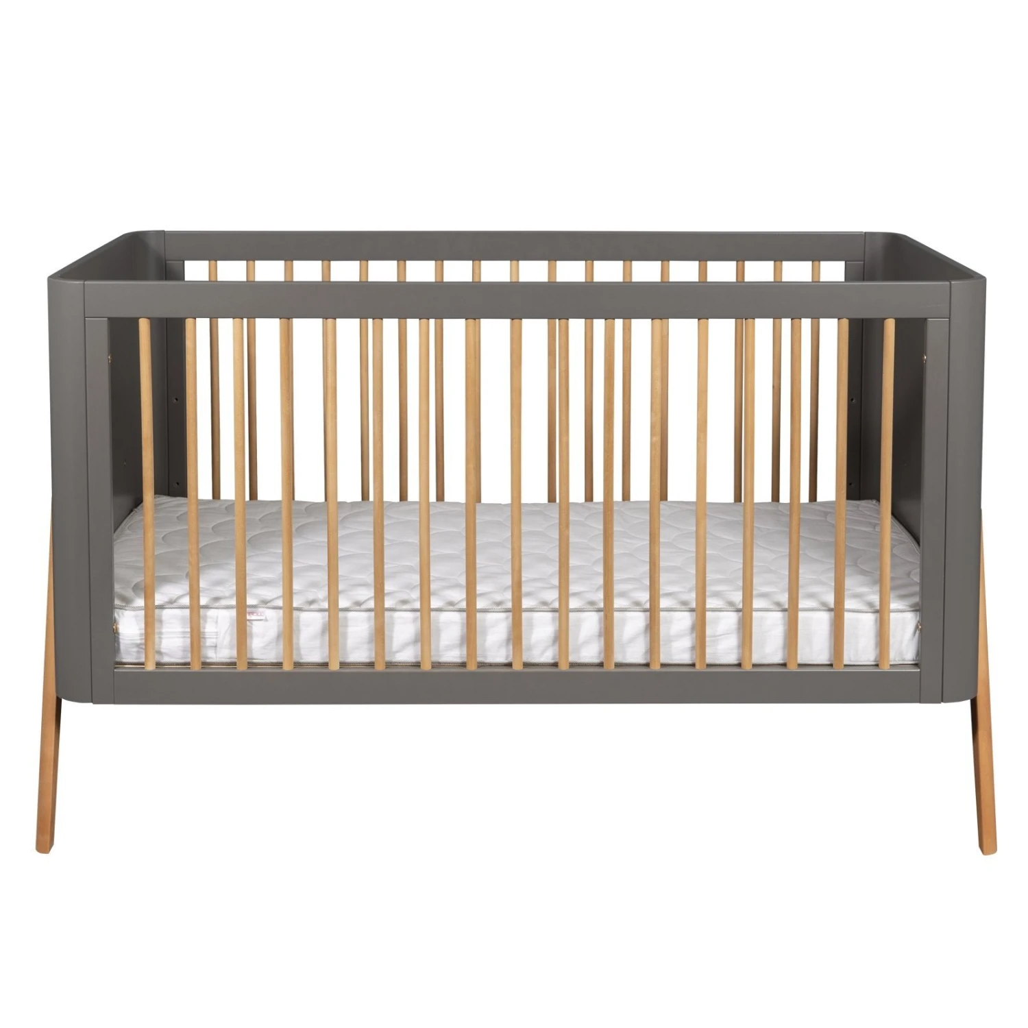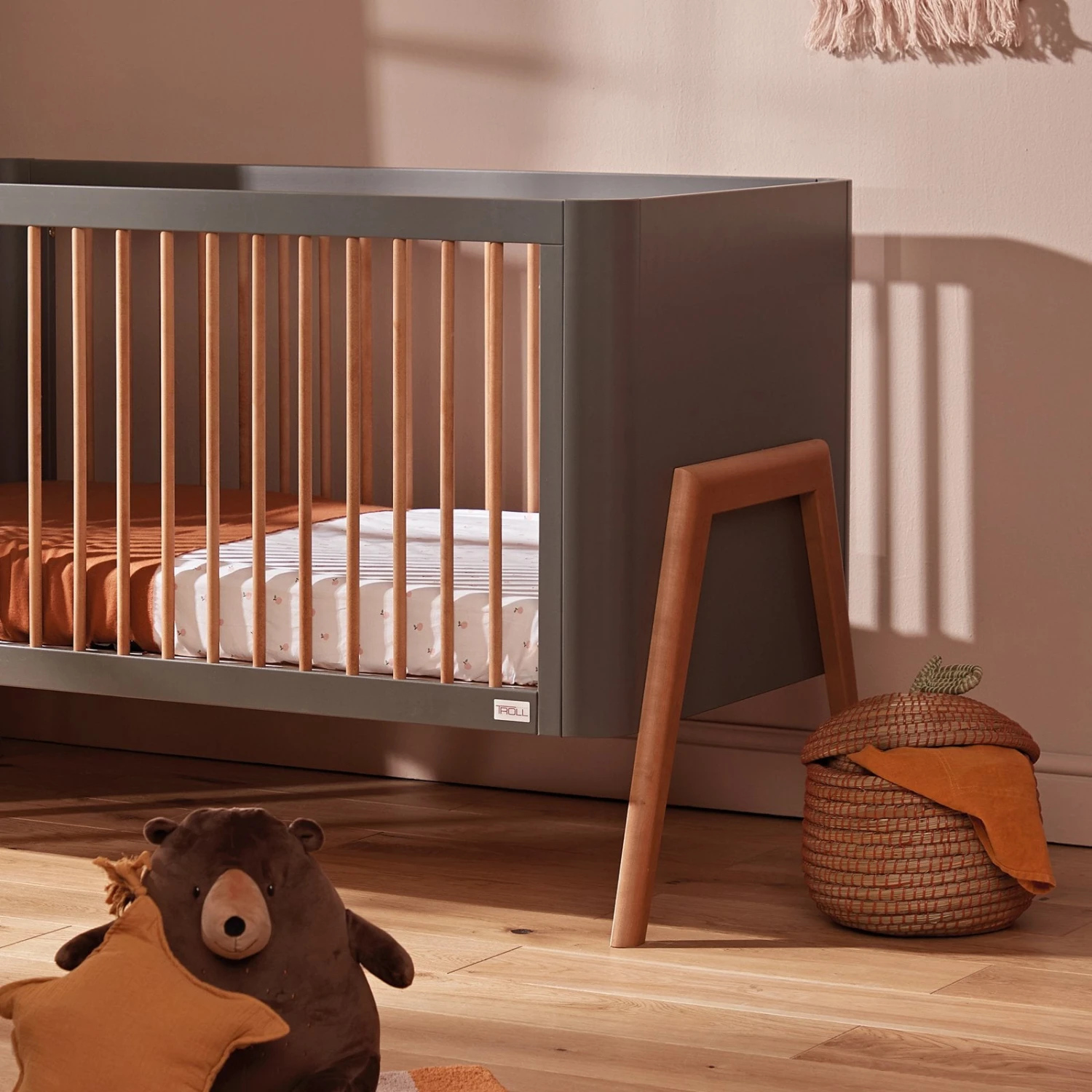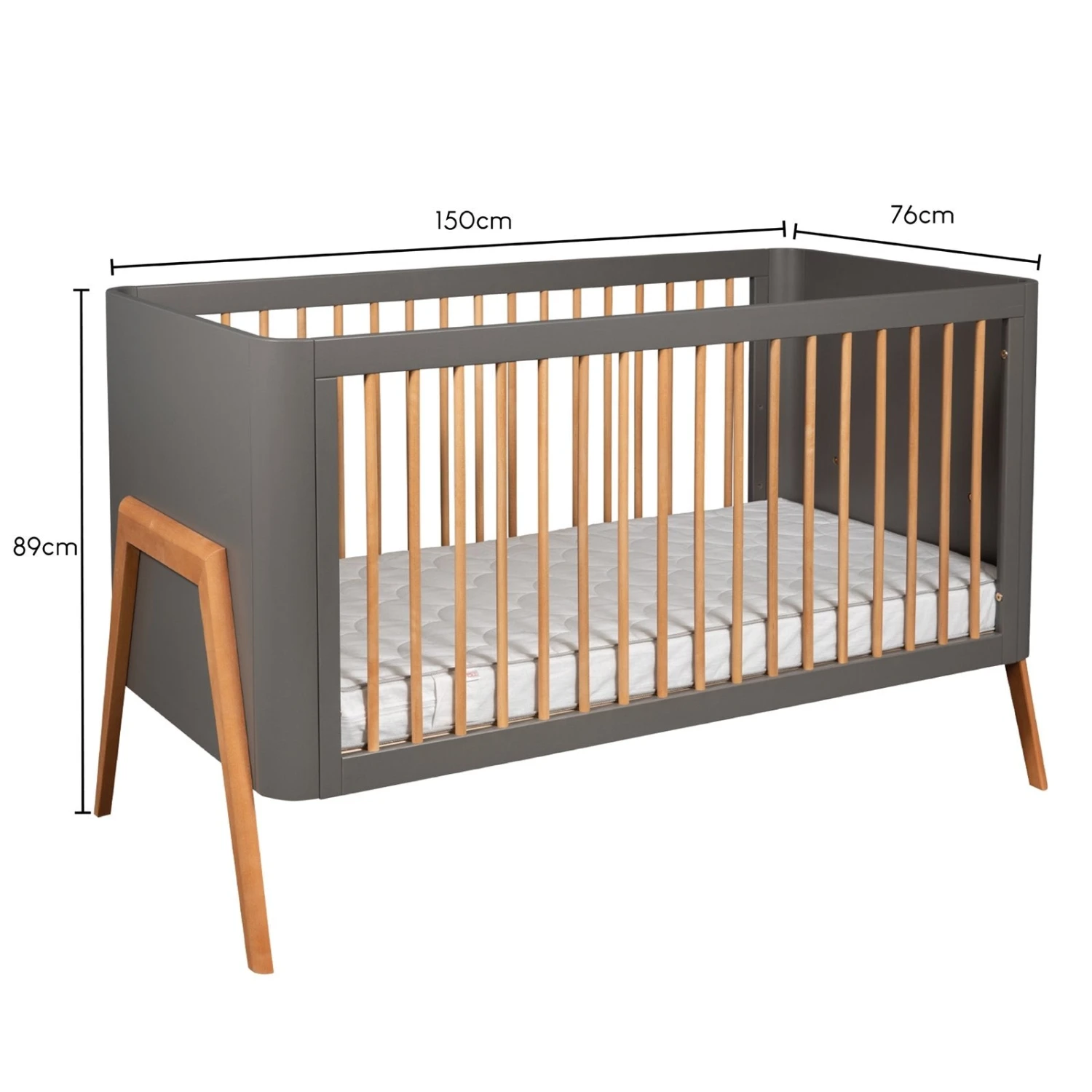 The Torsten cot bed is a beautiful example of Scandinavian design. The cot bed showcases softly curved edges and a striking angled leg design. The bold colour palette of dark grey with teak wax gives any nursery a contemporary look.